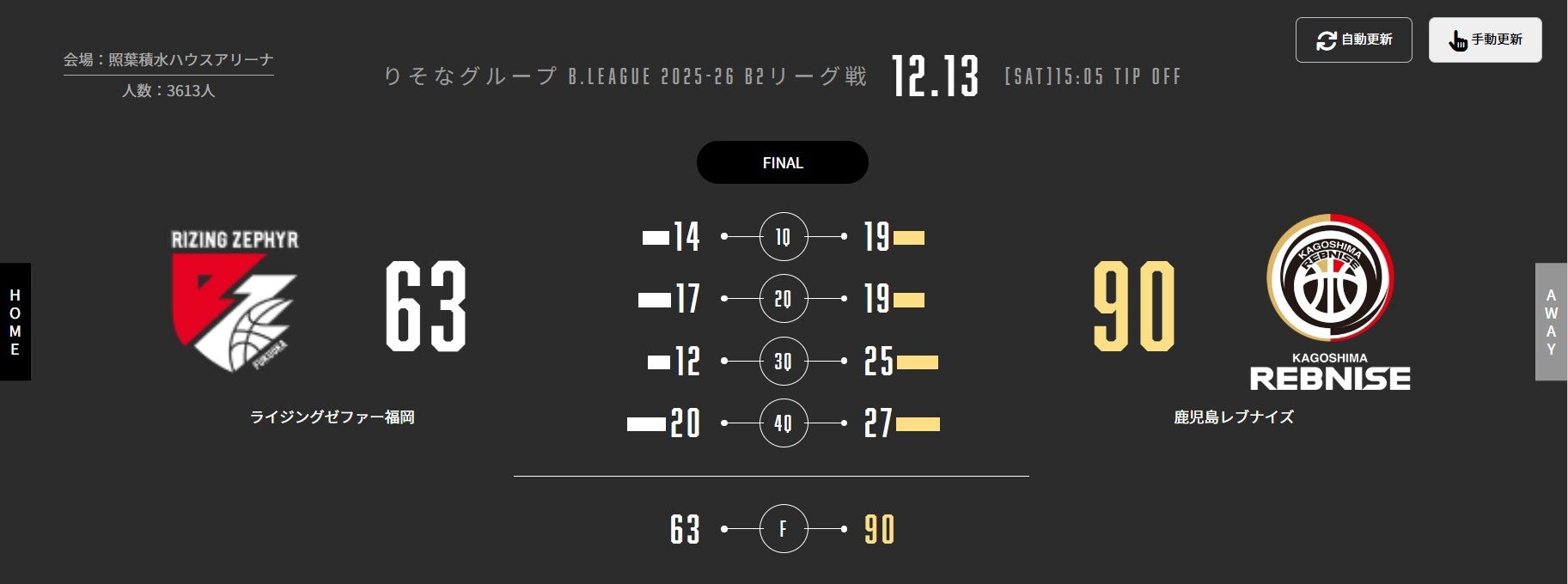 本日(12/13)、りそなグループ B.LEAGUE 2025-26シーズン 第13節 照葉積水ハウスアリーナでライジングゼファー福岡と対戦しました。試合結果をお知らせします。
