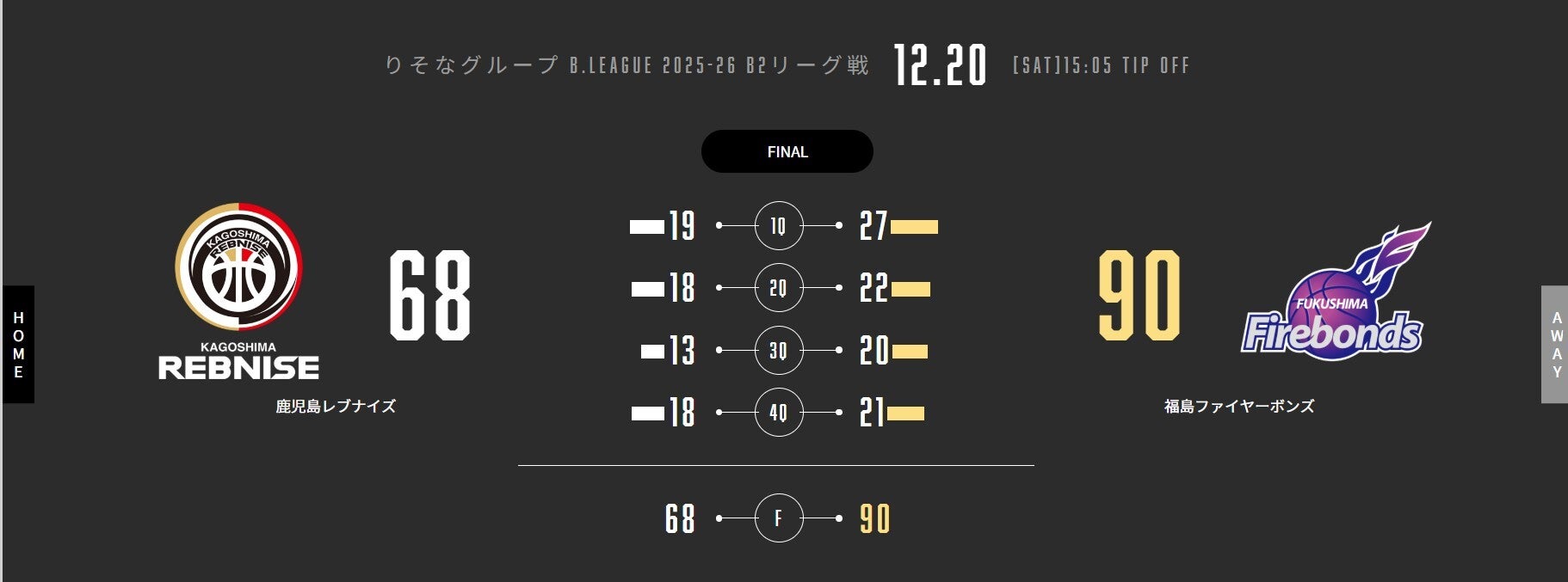 本日(12/20)、りそなグループ B.LEAGUE 2025-26シーズン 第14節 西原商会アリーナで福島ファイヤーボンズと対戦しました。試合結果をお知らせします。