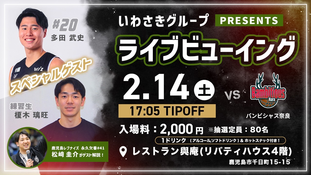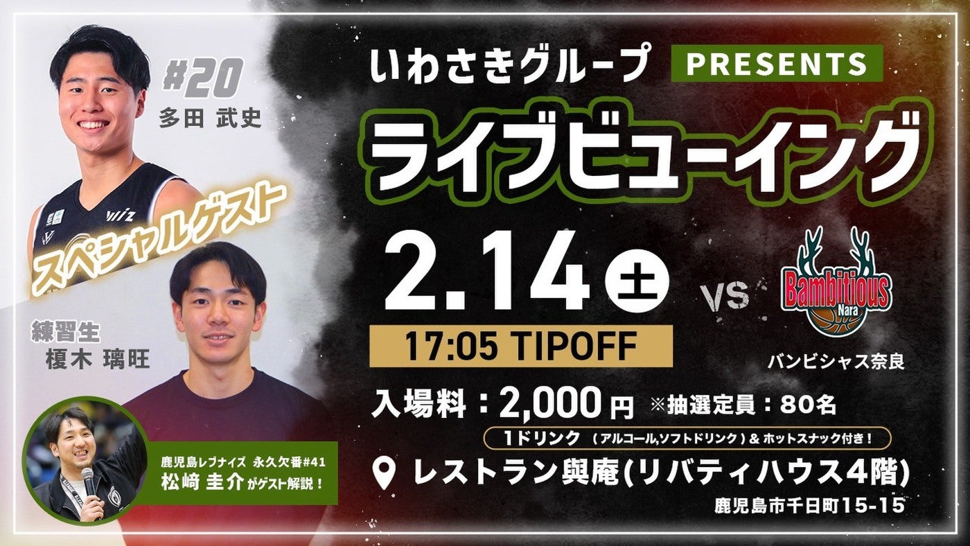 この度、鹿児島レブナイズでは、2月14日(土)にアウェーで行われるバンビシャス奈良戦のライブビューイングを天文館の『リバティハウス』にて開催することとなりましたのでお知らせいたします。