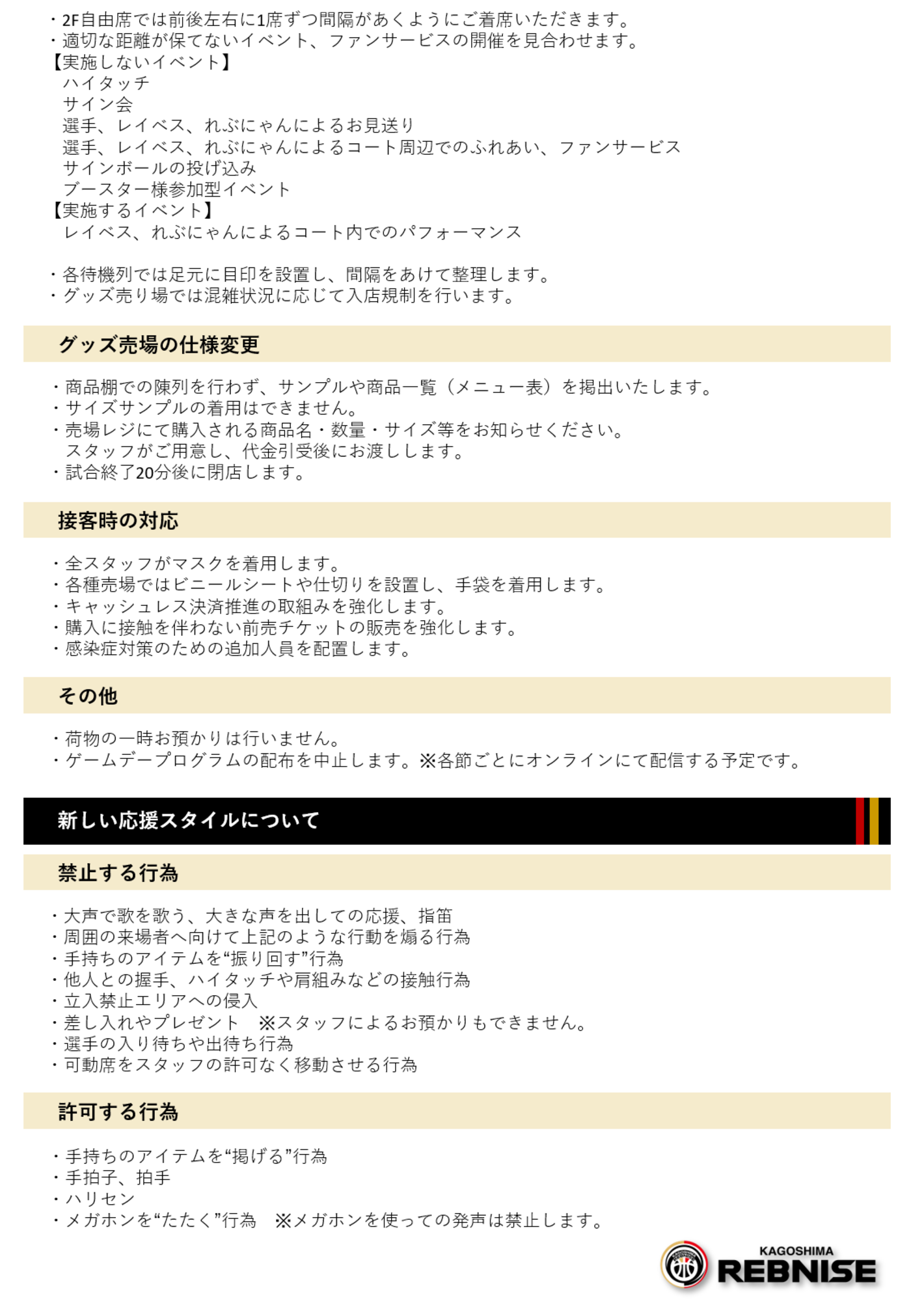 『B3リーグ新型コロナウイルス感染症対策ガイドライン』に準じ、鹿児島レブナイズは独自のルールを設定し、感染拡大防止への対策をとりながらホームゲームを運営してまいります。